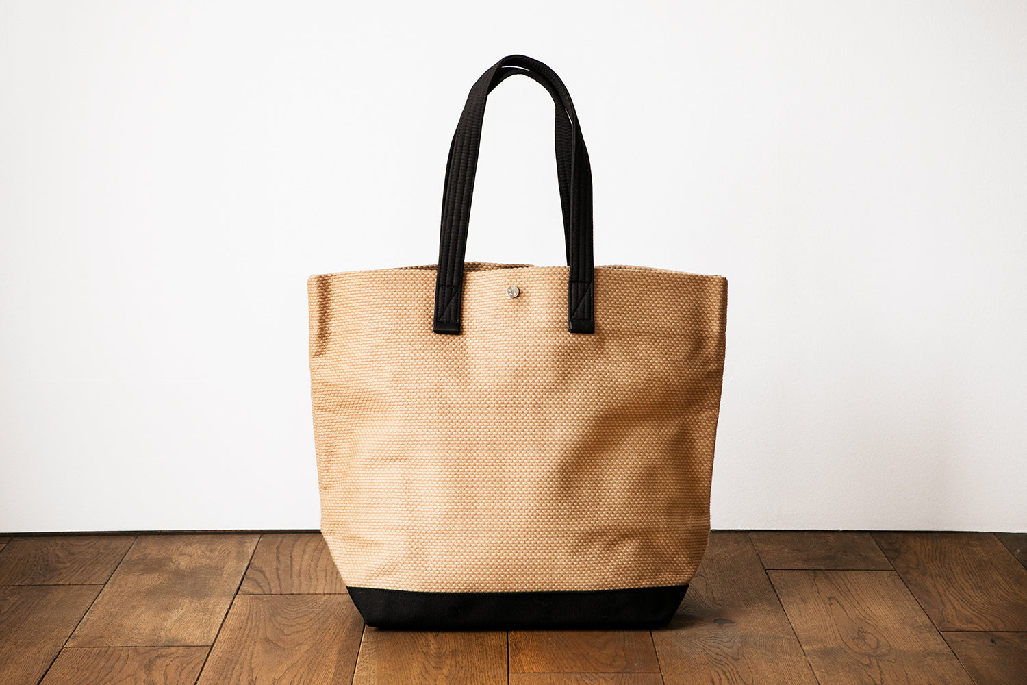カジュアルになりがちなトートバッグも、刺し子織の素材感とフロントのオリジナルスナップボタンのワンポイントで綺麗目なスタイルにも合わせやすいデザインになっています。