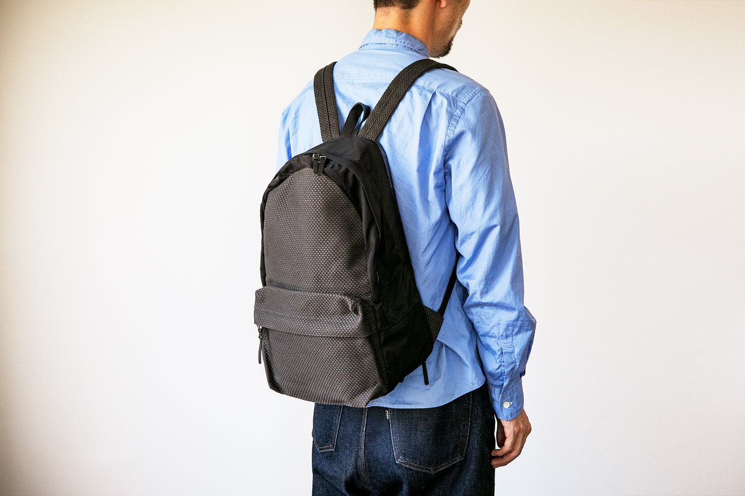 カジュアルになりがちなバックパックですが、ナイロンの光沢感と刺し子のコンビネーションで落ち着いた印象に。